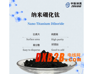 超细硼化钛(ZH-TiB2-02)等离子体高温煅烧+等离子体解聚制备,纯度高,粒径小,分布均匀,比表面积大,表面活性高,超细硼化钛陶瓷粉体是一种灰黑色粉末,粉末颗粒具有完整的六方晶体结构。其化学分子式为TiB2,分子重量69.52,密度4.52 g/cm3,熔点2980℃,显微硬度34Gpa,热导率25J/m.s.k,热膨胀系数8.1×10-6m/m.k,电 阻 率14.4μΩ.cm。二硼化钛粉体高熔点、高硬度、耐磨损、抗酸碱、导电性能好,导热性强,具有化学稳定性和抗热振性能,抗氧化温度高,能抗1100℃以下的氧化,其制品具有较高的强度和韧性。